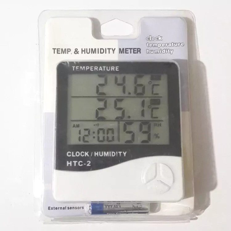 دماسنج رطوبت سنج 2 - HTC برای اندازه گیری دما و رطوبت محیط بکار می رود . این دما سنج دارای دو سنسور دما و یک سنسور رطوبت داخلی می باشد . سنسور دمای اول داخلی بوده و سنسور دمای دوم دارای سیم 1.5 متر می باشد . این ترمومتر دیجیتال محیطی بصورت رومیزی و یا دیواری قابل استفاده می باشد . این رطوبت سنج دیجیتالی محیط دارای تاریخ و ساعت حافظه ماکزیمم و مینیمم می باشد . دستگاه با یک باتری نیم قلمی چندین ماه کار می کند . مشخصات فنی : - اندازه گیری دمای داخلی : -10 تا 50+ درجه سانتی گراد - اندازه گیری دمای خارجی : -50 تا 70 درجه سانتی گراد -دقت اندازه گیری دما : 1 درجه سانتی گراد - اندازه گیری رطوبت : 99-10 درصد - دقت اندازه گیری رطوبت : 5 درصد - دارای حافظه ماکزیمم و مینیم گیری برای دما و رطوبت