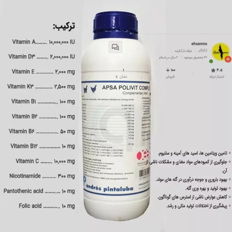 یکی از بهترین مکمل های پرندگان زینتی تامین کننده انواع ویتامین ها و اسید های آمینه مورد نیاز پرندگان محصولی کامل دارای تمام ویتامین ها و اسید های آمینه می باشد تقویت نطفه در پرندگان جوان و تازه کار و پرندگانی که چند دوره پیاپی جوجه کشی کردن و از نظر نطفه ضعیف شدن تشویق برای مستی و جفتگیری تامین ویتامین ها و اسید های آمینه جلوگیری از کمبودهای مواد مغذی و مشکلات ناشی از آن بهبود تولید و بهره وری گله کاهش عوارض ناشی از استرس های گوناگون پیشگیری از اختلالات تولید مثلی و رشد یک الی دو روز در هفته در تمام دوره ها 2 تا 3 روز پی در پی قبل از تخم گذاری 4 قطره در 100 میل اب